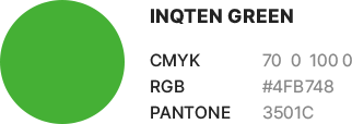 INQTEN-ний өнгөний утга нь 'INQTEN'-ыг илэрхийлдэг гол хүчин зүйл юм. Тус тусын мөн чанарт заасан өнгөний утгыг ашиглаж,, өнгөний тод хэмжээ ялгаатай байвал Pantone өнгийг стандартыг ашигладаг. RGB горимд ашиглах нь орчиноос хамаарч шинж чанар нь өөр өөр байж болох тул санал болгож буй өнгөнд тохируулан ашигладаг.